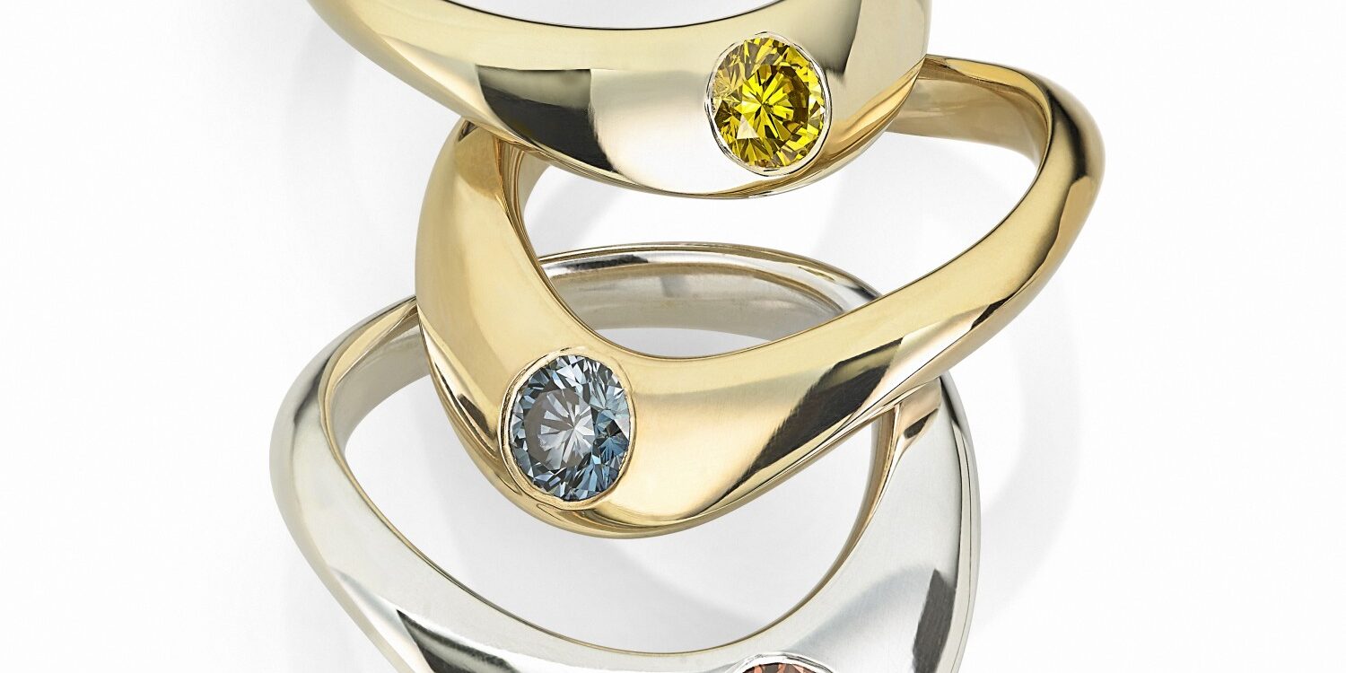 The collection comprises scintillating lab-grown diamonds in hues of pink, yellow, cognac and blue set in 18kt Fairtrade yellow, rose and white gold jewellery designs, including stack rings and bangles, drop earrings and pendants.